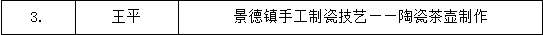 同时在3月15日,由景德镇文旅发布的第八批市级非物质文化遗产代表性传承人拟通过人员名单公示中,同样来自“百工百匠”非遗传播基地的叶菁、卫晶晶(景德镇传统釉下五彩瓷制作技艺)、王平(景德镇手工制瓷技艺-陶瓷茶壶制作)、孙君君(浮梁功夫红茶制作技艺)四位艺术家也成功入选。