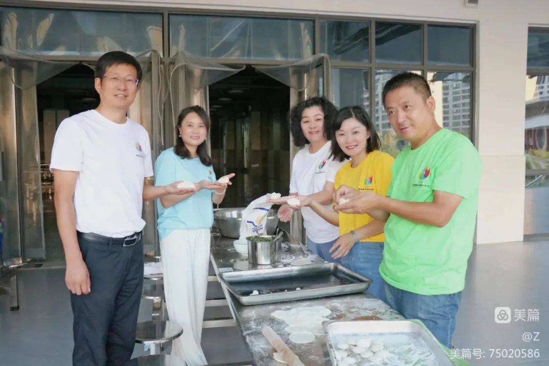 有趣的游戏结束后,大家来到食堂进行“打月饼,包饺子”比赛。一来到食堂,各组立刻相互合作,有的负责打月饼,有的负责做饺子。瞧!月饼组的老师们全身心投入制作。按照步骤:揉面团、包馅,有条不紊。以幸福做皮,思念为馅,把团圆的心意包裹在月饼里,将节日的祝福融入在美食中率先打出了一个个漂亮的月饼。饺子组的老师们更是合作默契,你揉面,他擀皮,我包馅,一气呵成。一个又一个的饺子横空出世,我们一起来看看老师们的成果吧!第一锅热气腾腾的饺子出炉了,大家纷纷上前品尝自己的劳动成果,吃着热腾腾的饺子,打着甜甜的月饼,脸上洋溢着甜甜的笑容,此刻的食堂满满都是温暖与幸福。