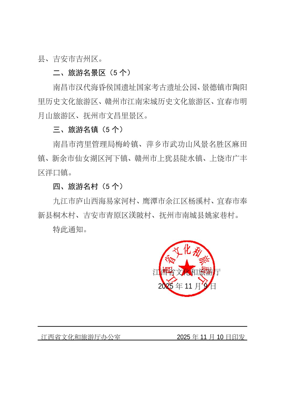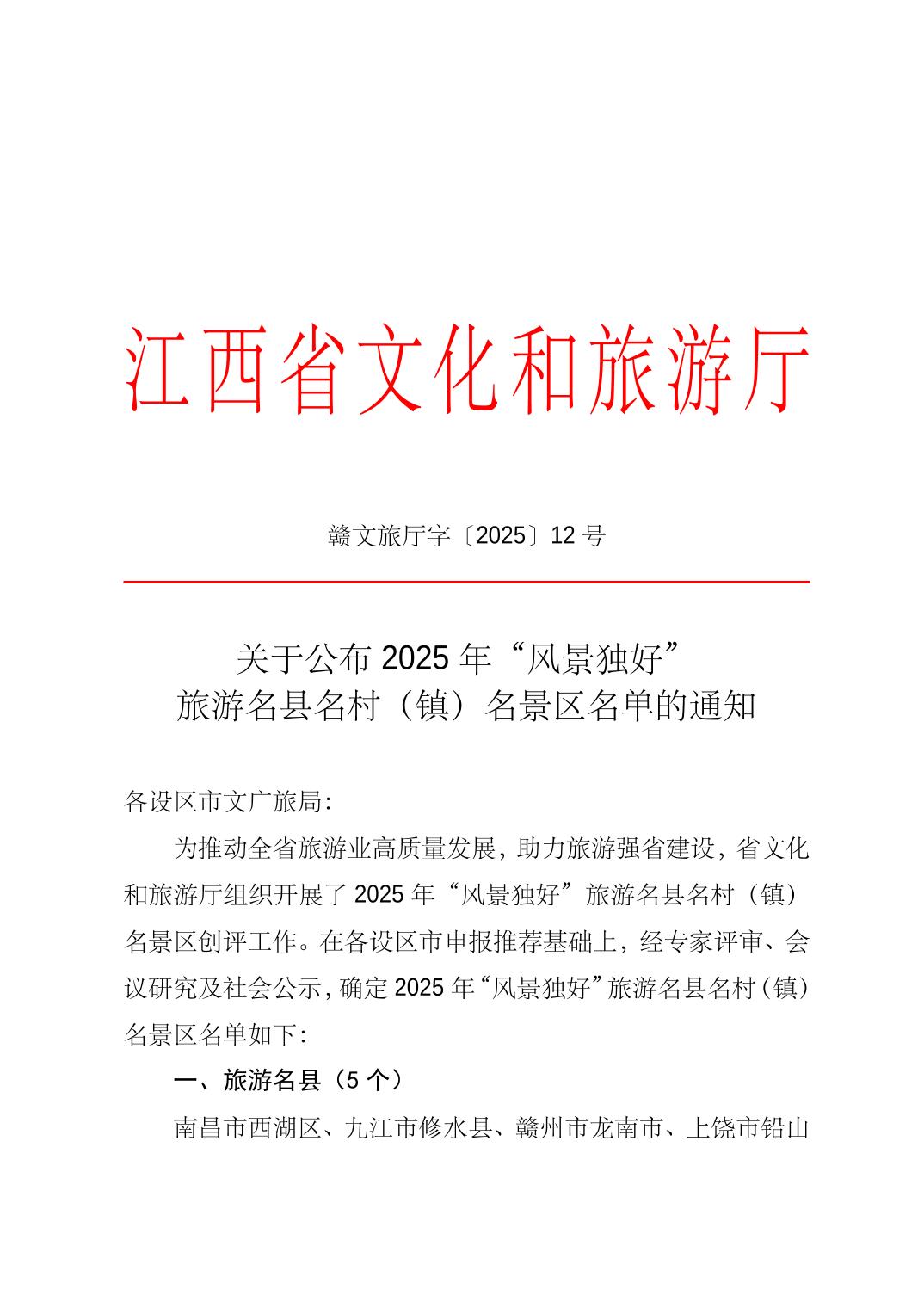 关于公布2025年“风景独好”旅游名县名村(镇)名景区名单的通知