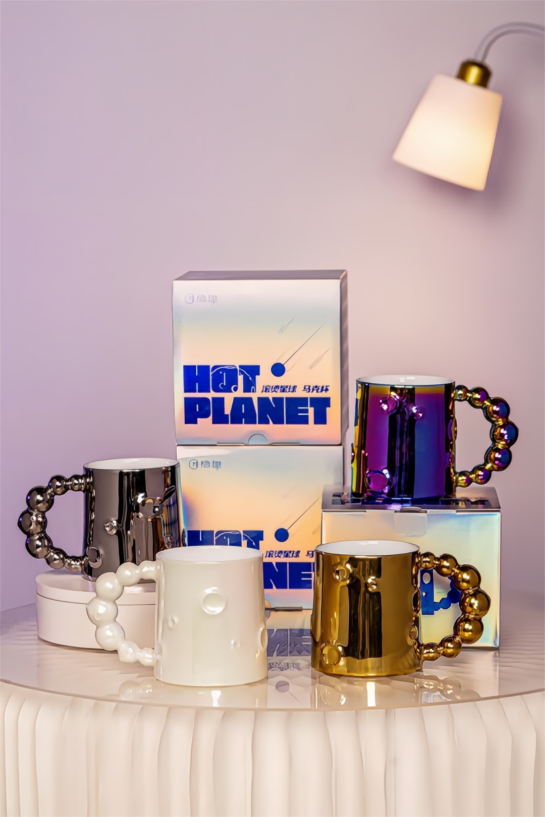 造型设计采用,小行星撞击后留下的陨石坑,作为杯身的肌理,形成独特具有幻想的新潮单品,目睹星球诞生,宇宙的神秘。七颗星辰相连“七星连珠”,从小变大,再变小,形成独特的把手造型,握感舒适。
