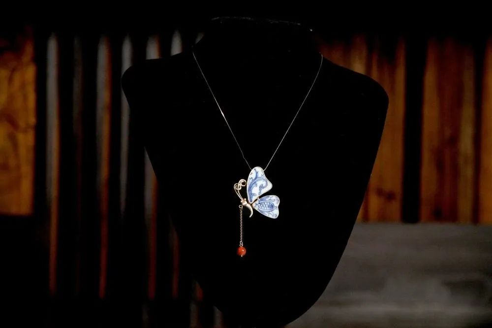 此产品以清代道光期间的古瓷片作为造型设计基础,对古瓷片进行切割修饰,与银器相结合;仿生蝴蝶造型,以古瓷片青花图案装饰蝴蝶羽翅,更添几分灵动,充分体现其古瓷片的装饰和应用效果,将蕴含着中国文化的古瓷片与现代技法相结合。实现了将传统文化艺术与现代装饰艺术相融合,有很好的装饰效果、审美效果和文化艺术内涵,更好地体现出古瓷片装饰品的韵味和装饰品质。