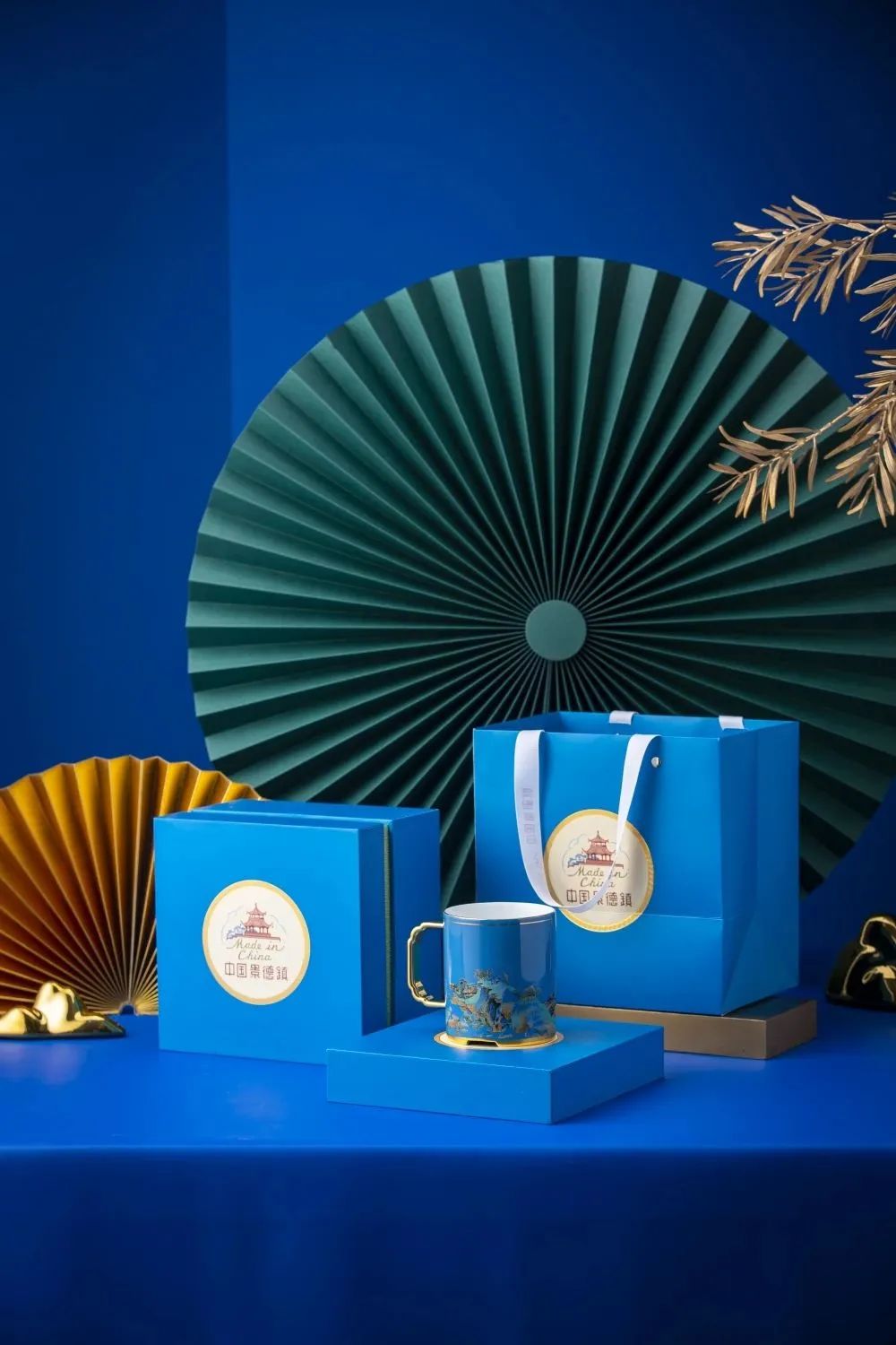 《千里江山》是以《千里江山图》为装饰的陶瓷产品,设计中巧妙用传统珐琅彩的经典蓝为底色,再配上经典锦地文,与《千里江山图》中的青绿山水不仅色调上和谐统一,而且在文脉上统一,在造型上也采取简约的中式样式,使这套瓷器整体上浑然天成。