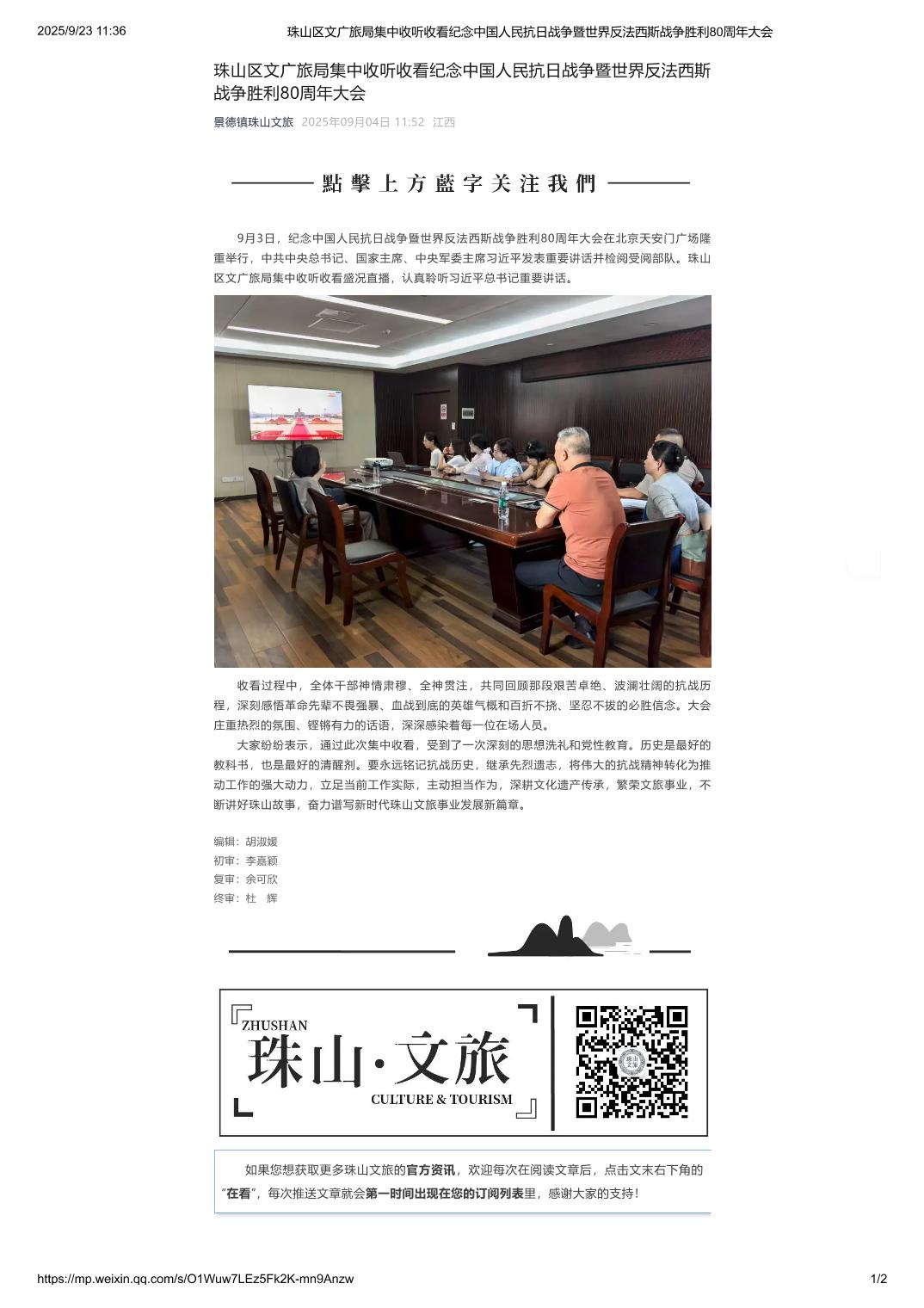珠山区文广旅局集中收听收看纪念中国人民抗日战争暨世界反法西斯战争胜利80周年大会