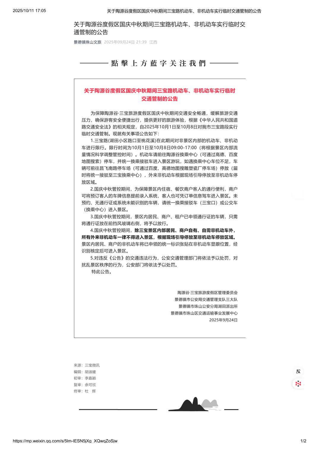 关于陶源谷度假区国庆中秋期间三宝路机动车、非机动车实行临时交通管制的公告 景德镇珠山文旅 2025年09月24日 21:39 江西