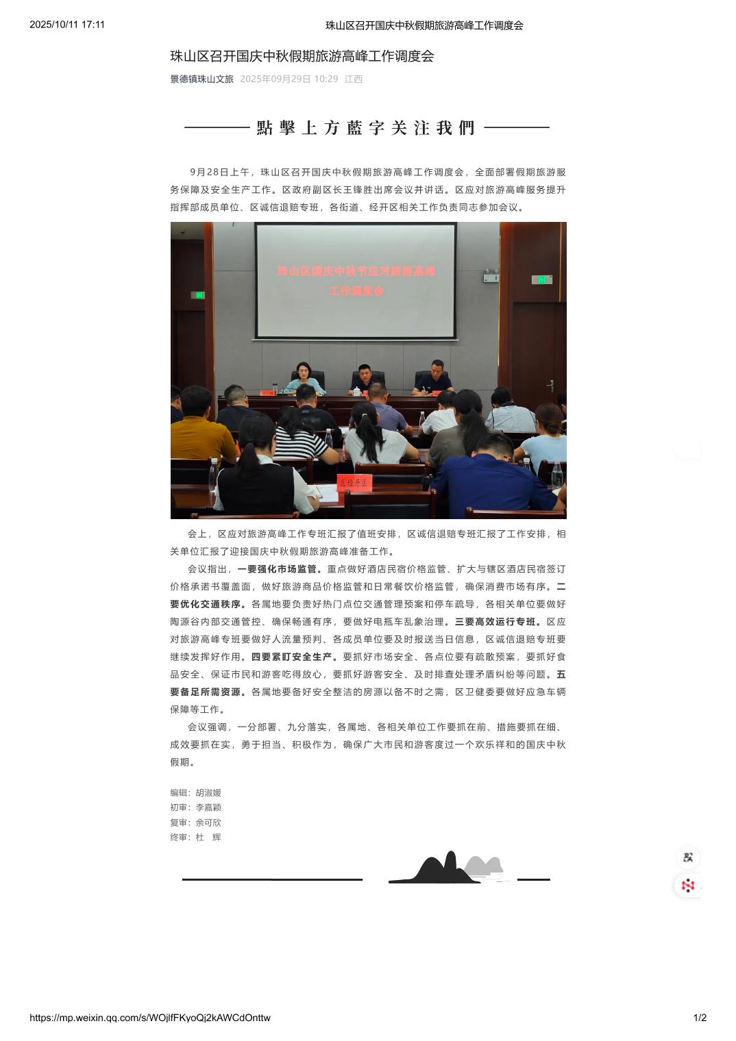 珠山区召开国庆中秋假期旅游高峰工作调度会