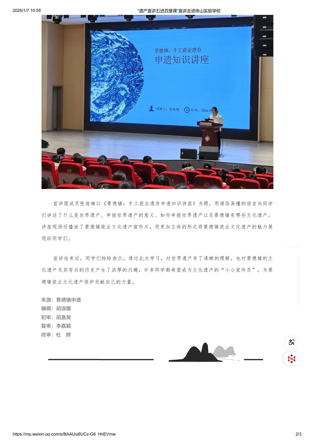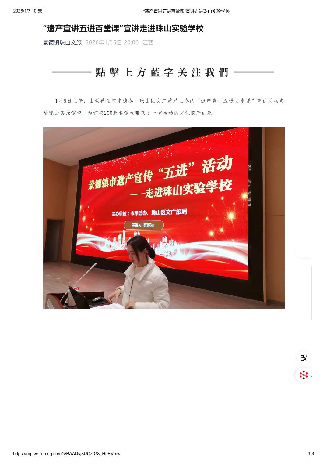 “遗产宣讲五进百堂课”宣讲走进珠山实验学校