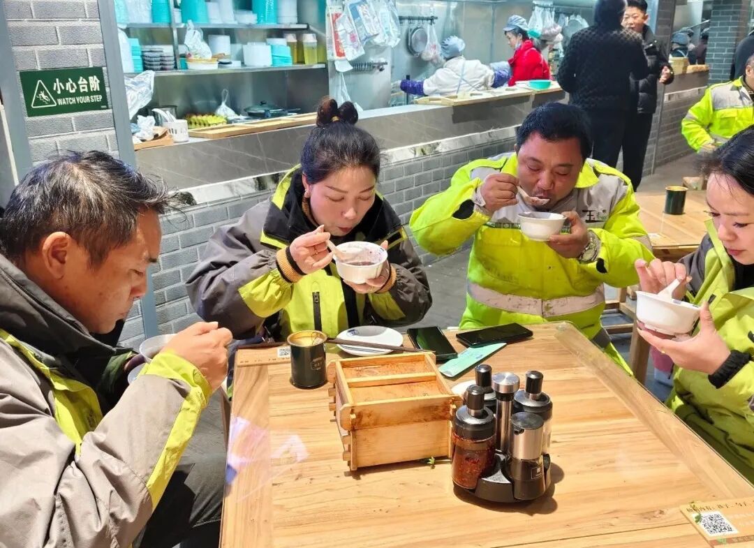 为弘扬中华民族传统文化,营造浓厚的节日氛围,传递社区的关爱与温暖。腊八节当天,桂花弄社区党委联合辖区爱心企业鱼汤面馆,邀请玉和田环卫工人、外卖小哥等户外一线工作人员,开展“新群体新生活 好味道好‘粥’到”主题活动。