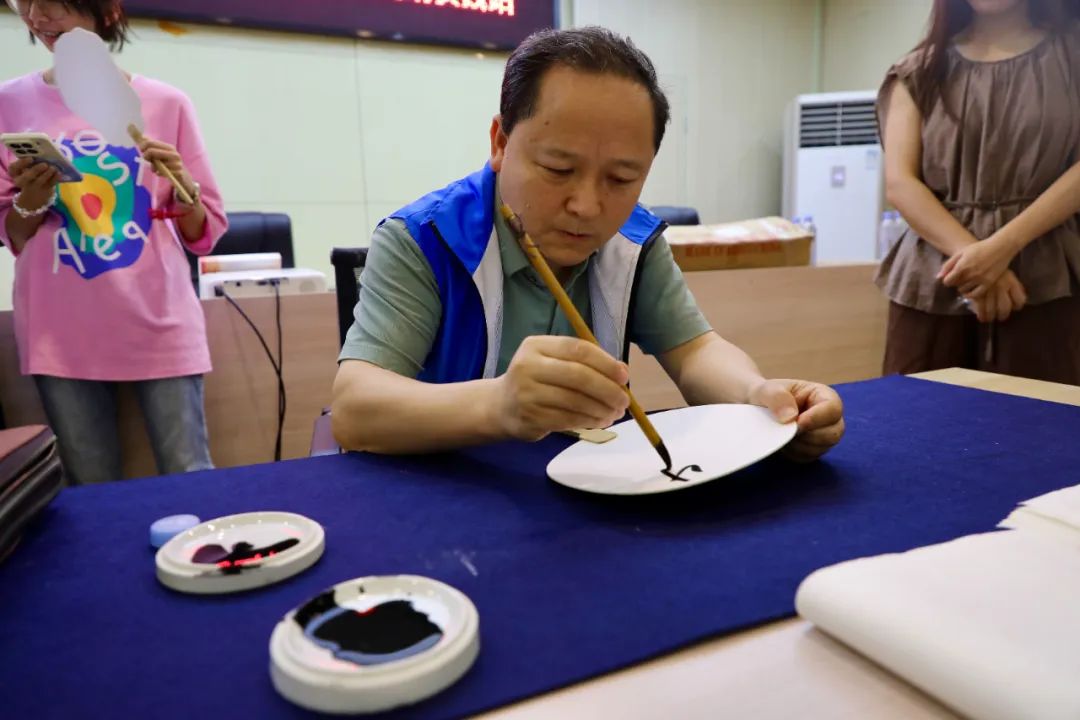 活动的互动环节精彩纷呈。文艺导师汪开潮现场挥毫泼墨,以“申遗”为主题,在素雅的扇面上创作书法作品。现场的大学生纷纷围聚案前,有的手持纸扇,请汪开潮老师在扇面上题写非遗文化相关内容。非遗导师盛志江则沉浸式地展示了传统绘画技艺,同学们近距离欣赏他笔下栩栩如生的骏马图,纷纷拿出手机拍摄老师的佳作,感受申遗文化的独特魅力。