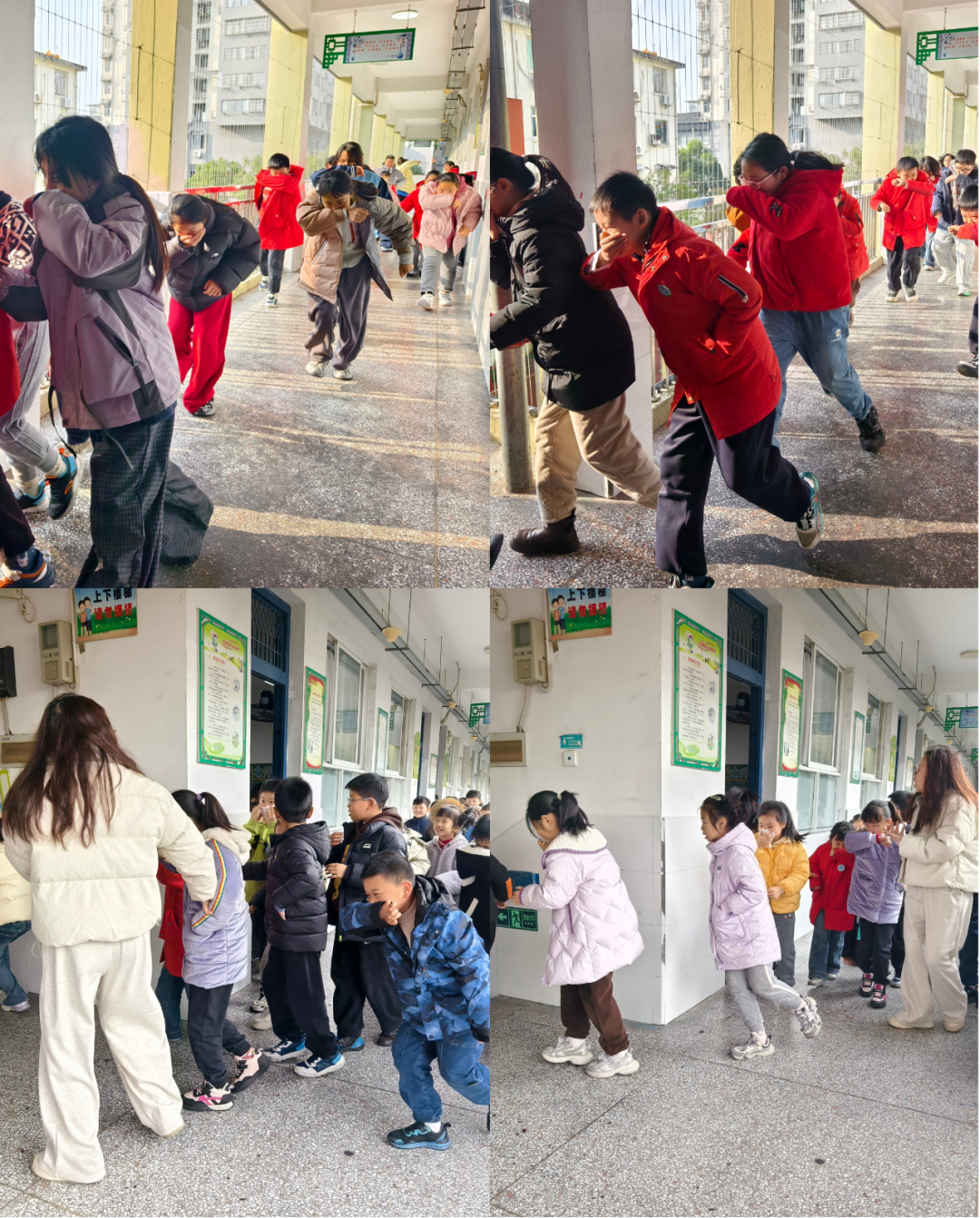 上午9时分,伴随着急促的火灾警报声响起,演练正式拉开帷幕。学校广播系统立即发布紧急疏散通知,模拟因电路短路引发火情、浓烟扩散的场景。全体师生迅速进入应急状态,各班任课教师及班主任立即转换为疏散引导员,沉着指挥学生用湿毛巾、衣物等捂住口鼻,弯腰低姿,按照“前后门分流、贴墙右行、先低层后高层”的预定疏散原则,快速、有序地撤离教室。