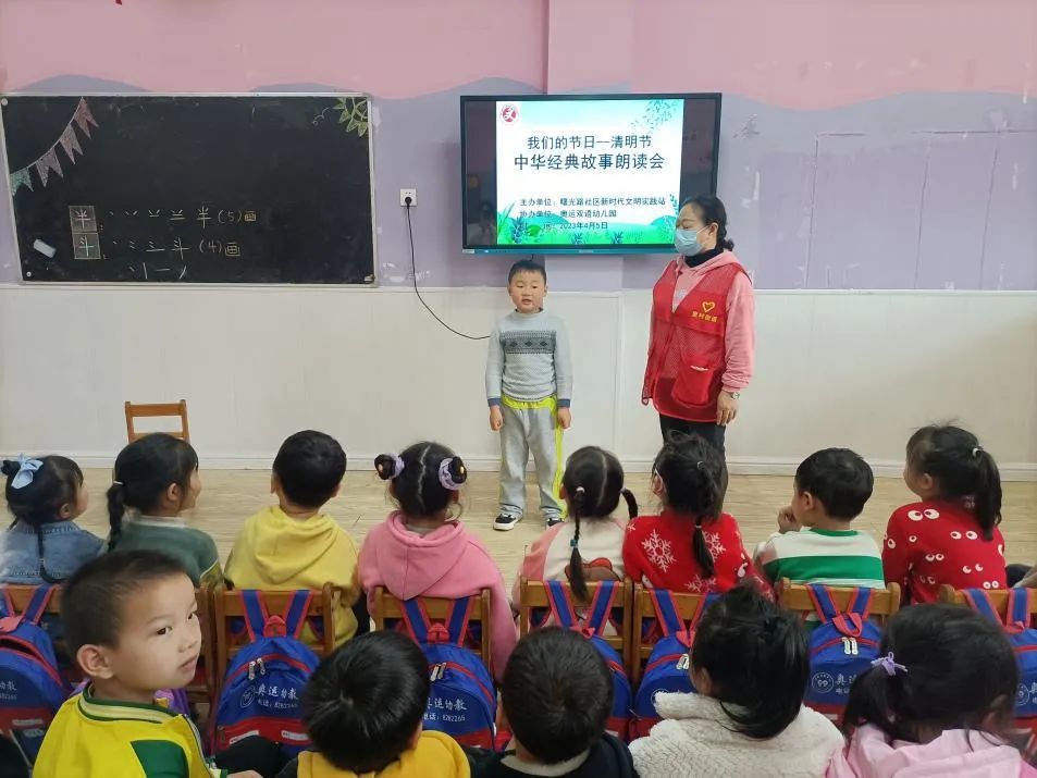 又是一年芳菲始,又是一年清明时。为弘扬传统文化、传承红色基因,从小培育爱国主义情怀,4月5日,里村街道曙光路社区新时代文明实践站携手奥运双语幼儿园,共同开展了“中华经典故事朗读会”清明节主题活动。