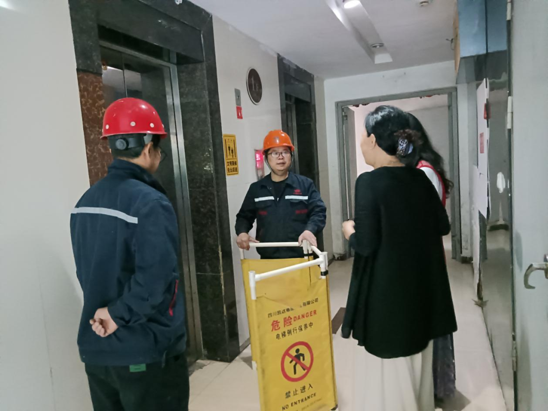 当天的演练模拟长虹金域中央小区一台电梯突发故障,2名乘客在电梯层间被困。被困乘客使用电梯内一键紧急呼叫装置求救,电梯管理人员接到求救电话后,立即启动应急救援预案,一方面安排人员到现场与被困乘客取得联系,安抚被困乘客情绪,并对电梯做好围挡提示;另一方面通知维保单位赶赴救援。5分钟后,救援人员赶到现场,立即排查故障,确认轿厢具体位置,制定救援方案。10分钟后,被困乘客被顺利解救,维保单位对该电梯开展维保检修,保障电梯安全运行。