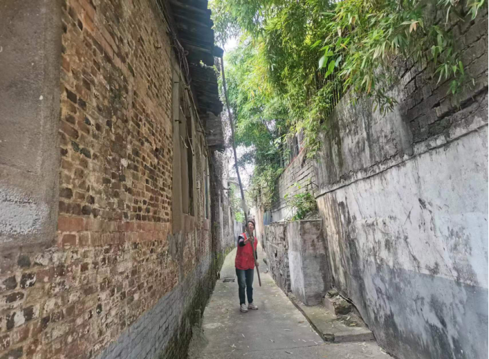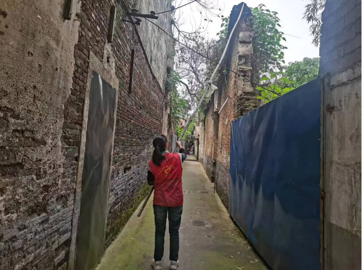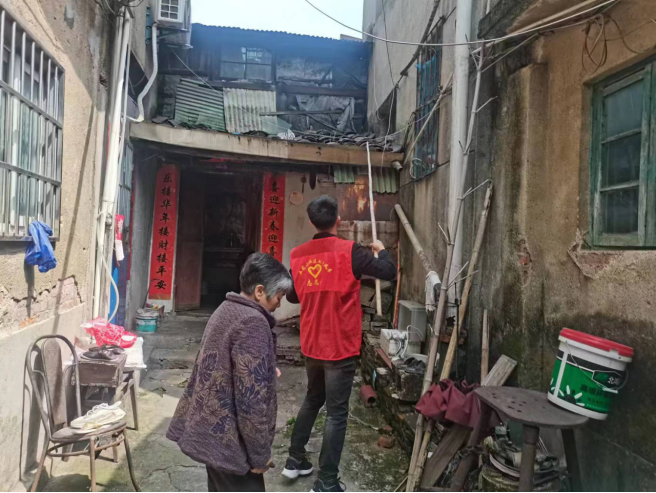 自石狮埠街道开展危房安全排查专项工作以来,各社区对辖区内年代久远的房屋进行逐门逐户登记排查,在排查中社区干部发现里弄中的房屋屋顶存在砖头松动的情况,又逢雨季,存在很大的安全隐患,于是社区干部就请来“竹竿”协助排险,所以就有了手持竹竿在里弄中的红色背影。