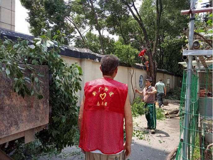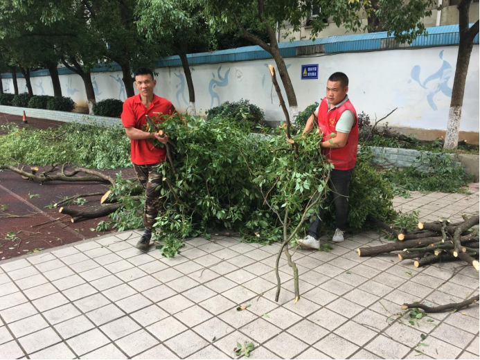 社区网格员发现此情况及时反映给社区,社区郭主任立即前往现场查看,了解情况后,与市园林处、十三中学校和小区居民沟通协调,为保证施工安全,决定周六学校放假,对这棵大樟树进行高空修枝,及时装车、清理修理后的枝杈,以保证师生、居民和车辆的正常安全通行。