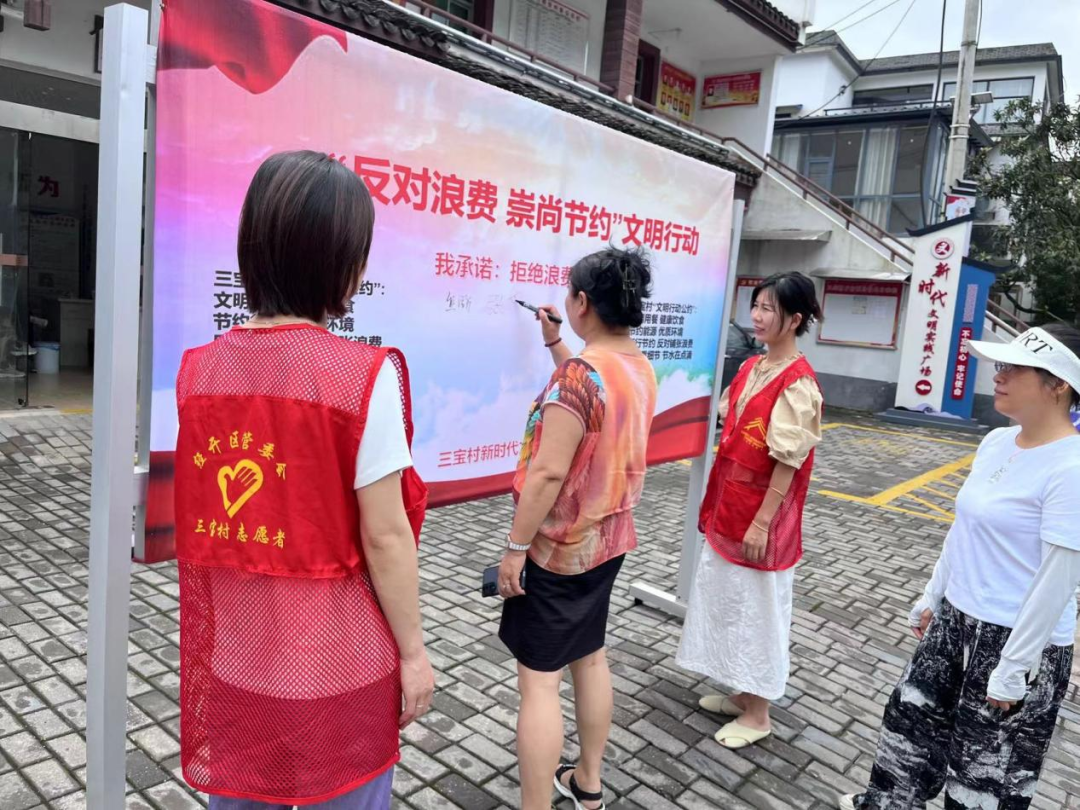 近日,三宝村新时代文明实践站组织志愿者们在辖区内开展了“反对浪费 崇尚节约”文明行动宣传活动,着力引导辖区居民群众养成勤俭节约的良好习惯。活动现场,志愿者们站在广告牌前给来往的居民、游客讲解“反对浪费 崇尚节约”的理念,同时由村干部带领大家郑重地在广告牌上签下自己的名字,呼吁大家从树立正确理念、节约用水、节约用电、节约用纸、文明用餐等方面号召大家要做勤俭节约的宣传者、倡导者和实践者,在文明健康的生活方式中享受幸福生活!此次活动不仅增强了大家勤俭节约的意识,也带动了大家将俭以养德、俭以养性、俭以养身的新时代美德生活理念转变为自觉行动。