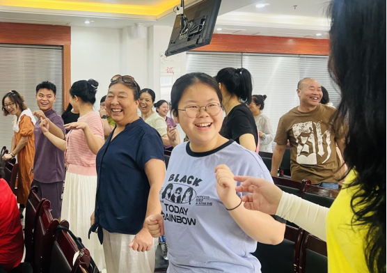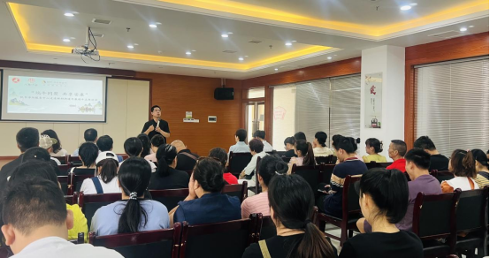 活动在集体吟唱李隆基的《端午》中拉开帷幕,张老师从端午节的来历、习俗、演变、活动等,为大家详细讲解端午节的来历、通过“阿水的故事”“打哈欠”“传递微笑”等小游戏,来训练专注力、调节情绪达到养生的目的,他的讲解生动有趣,互动性强,现场不时响起阵阵笑声。