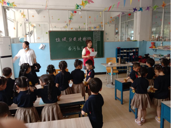 活动中,由社区党支部、计生协、妇联、关工委等成员组成的环保宣传志愿者队来到了辖区快乐艺术幼儿园,带领孩子们一起学习垃圾分类小知识。志愿者们从为什么进行垃圾分类到如何进行垃圾分类给孩子们上了一堂生动的垃圾分类课,让孩子们在寓教于乐中学习垃圾分类知识。