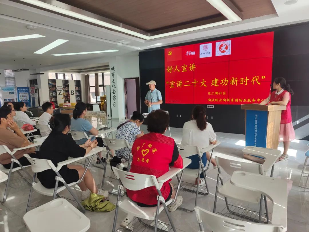 7月20日下午,东三郡社区党委、新时代文明实践站联合陶新家园小区物业邀请江西好人程赣生开展"好人宣讲”,宣讲主题是:“宣讲党的二十大 建功新时代"。