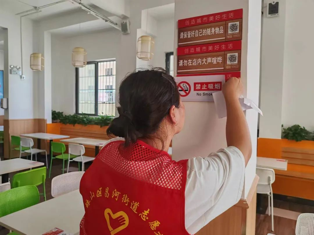 进一步增强居民控烟戒烟意识,营造一个健康、安全、无烟的营商环境,7月29日,昌河街道梦园社区以新时代文明实践站为依托,组织微网格员在网格店面内张贴控烟标识,开展控烟宣传活动。