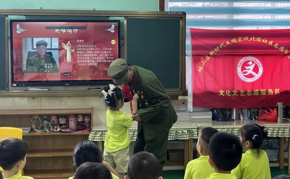 本次活动邀请了辖区对越自卫反击战抗战老兵伍油喜同志。伍爷爷和小朋友们分享了曾参加,法卡山战役、1984年至1987年的对越自卫反击战,以及扣林山,科甲山战役和防御作战的故事。