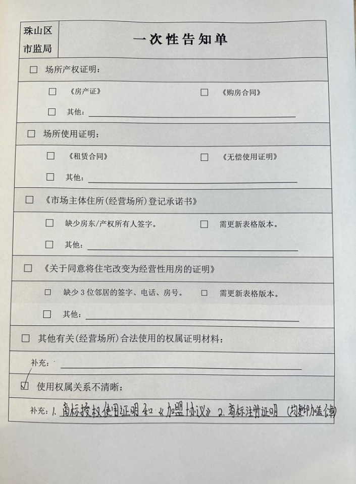 为方便群众办事,避免群众因材料不齐来回跑,珠山区市监局制定了“材料补齐一次性告知单”,将群众办理各类业务所需材料以及材料具体形式以材料清单模式实现一次性告知。针对群众办事过程中材料不齐的情况,窗口会出具“材料补齐一次性告知单”,由窗口服务人员根据群众办理的具体业务进行勾选补充,将需要补齐的材料一次性告知群众,避免出现群众因为材料不齐来回跑、办不成的情况,提升群众满意度。