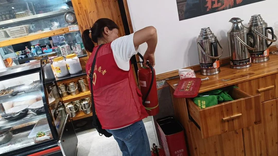 排查行动中,半边街社区志愿者对商铺内的灭火器、燃气泄漏报警器进行了排查。重点排查了灭火器是否过期、灭火器压力是否在合理范围、灭火器位置是否摆放合理和燃气泄漏报警器安装位置距离燃气灶距离是否合理、安装距地面高度是否合理、安装位置是否通风良好。针对现场排查发现的安全隐患,要求商铺限期整改到位。