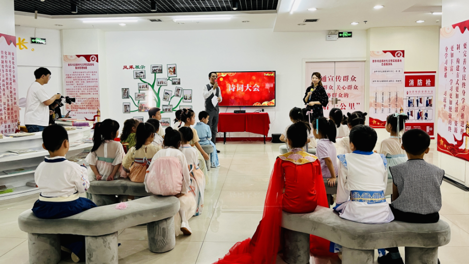 传承中华优秀文化,增进中小学生们文化认同与文化自信,9月23日,景德镇市新华书店联合新村街道梨树园社区携手主办的“梦回唐诗三百首”沉浸式阅读会,在市新华书店二楼新时代文明实践基地开展。