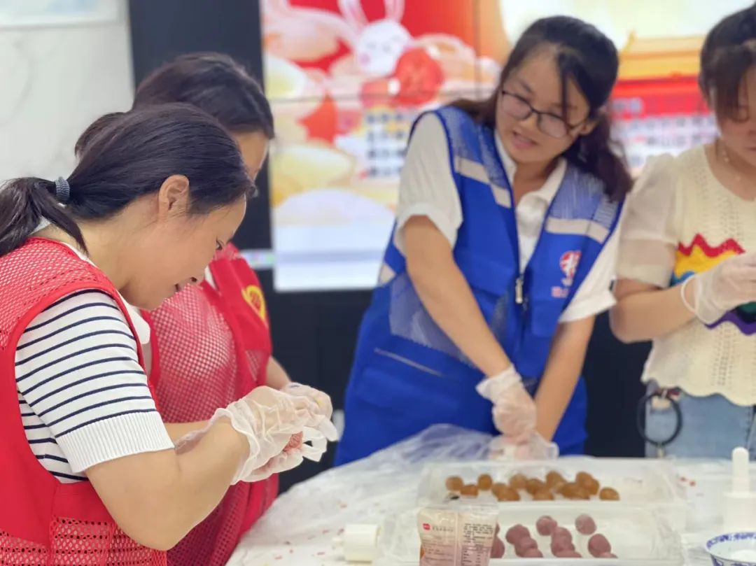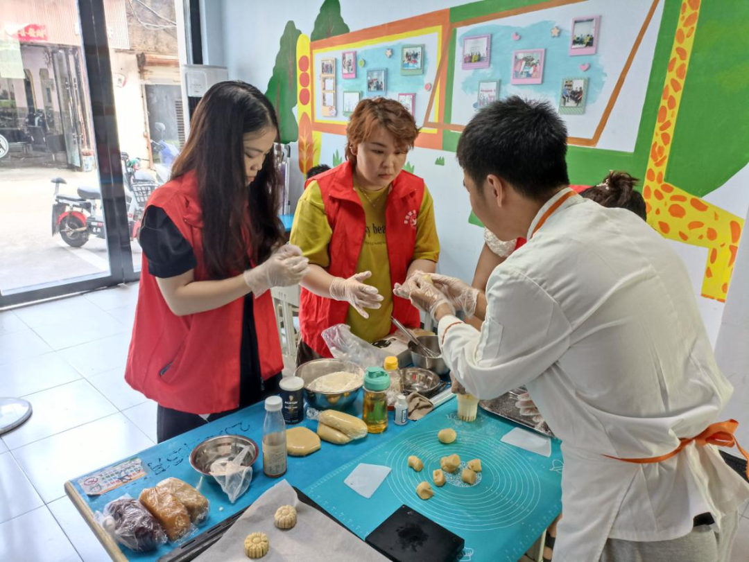 活动现场,居民朋友们准时到达“景快跑”暖心红色驿站。在工作人员的声声祝福下拉开了活动序幕。随后迎来了月饼DIY,志愿者们发放材料,当制作食品材料拿到手上,居民们熟练地将面团分拣成一个个饼皮,搭配馅料,搓成丸子状,纯手工按压定型,在其乐融融的祥和氛围中,大家互帮互助,制作出了一个个造型各异,栩栩如生的月饼。活动的同时,社区网格员还与居民拉拉家常,增进居民对网格员的认识,加强了居民的沟通,拉进了居民的距离。月饼出炉后,街道党工委副书记黄皓民和社区主任曾樱还向孤寡老人和清洁工人分发了制作好的月饼,并把制作好的月饼送到行动不便的孤寡老人家里,让社区充满浓浓的“中秋味”。