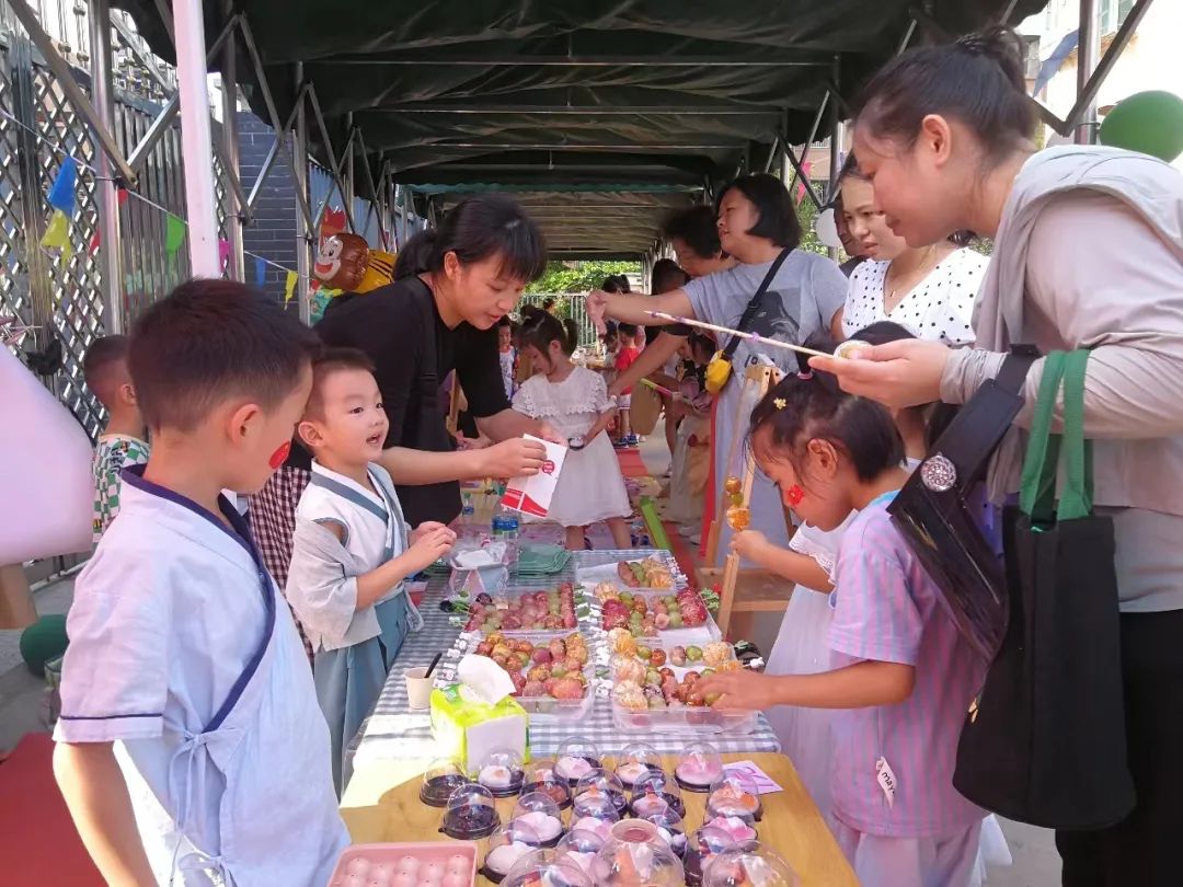好物共享,美食共享,传递快乐,一件好物,一道美食,为幼儿增添一段不一样回忆,“好物”遇到了“新主”,“美食”遇到了“吃货”快乐故事在这里重新开始。活动开始,幼儿园人潮涌动,小摊主们都坐在自己亲手设计制作的摊位面前拿着零钱蓄势待发准备迎接光顾的“小客人”。园内摊位琳琅满目,有爆米花、棉花糖、凉粉、烤肠、蛋挞、寿司、玩具、套圈圈、课外书、灯笼……每个摊位都标好价位供小朋友根据自己喜好自主选择购买。