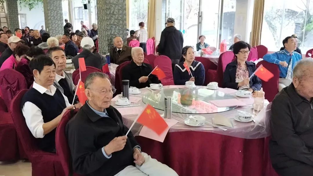 “没有共产党就没有新中国,共产党勤劳为民族,共产党一心为中国…”动人的大合唱感染了在座的老同志们,他们手搖国旗边看边唱,整个现场呈现出一派欢腾景象,标志着老干部们对共产党的无比热爱。