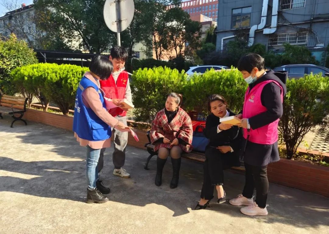 为有效预防和制止家庭暴力,保护家庭成员的合法权益,开展11月25日“国际反家庭暴力日”普法宣传活动,曹家岭社区新时代文明实践站组织党员志愿者、计生协、妇联、网格员等开展“拒绝暴力·反家暴有我”普法宣传活动,呼吁群众对家庭暴力说“不”。