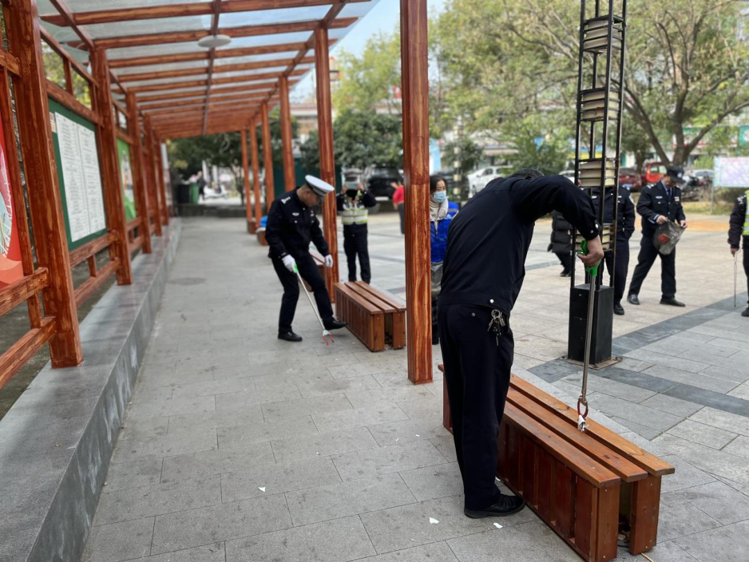 整个活动过程中,大家热情高涨,干劲十足,不怕脏、不怕累,手拿清洁工具,分工合作、互相配合,将散落在休闲广场座位底下和广场周边的塑料袋、瓶罐等垃圾清理干净,用实际行动呼吁广大市民爱护环境卫生,保护生活家园。一抹“志愿红”和“警察蓝”为广场增添了一道亮丽的风景。
