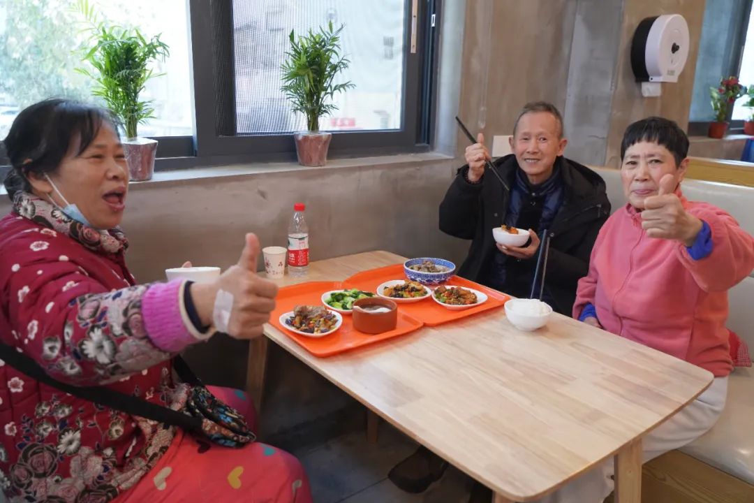 现场用餐的老人络绎不绝,许多老人三五成群、结伴而来,围坐在一起,大家边吃边聊,非常开心,面对记者的镜头,不少老人都挑起大拇指,为幸福食堂点赞!