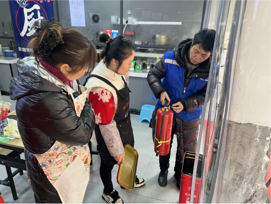 社区工作人员首先对辖区的沿街商铺进行信息登记,完善辖区生产经营台账,同时针对燃气使用环境、灶具、消防设施等情况进行重点检查。提醒商铺注意经营卫生、用火用电安全,做到文明经营、安全经营,杜绝消防安全事故的发生。其次,工作人员还对商铺灭火器材是否过期、灭火器材是否配备齐全符合标准规定、是否存在飞线充电及电线是否存在悬吊、拖地等现象进行检查并登记相关信息,以便定期巡查,进一步消除辖区安全隐患风险。