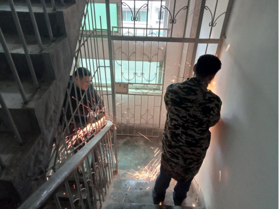 拆除现场,工作人员耐心宣传和讲解防盗网拆除的相关政策,在取得商户理解与支持和做好拆除工作的安全措施后,请来专业的施工人员,对各经营性场所防盗网(窗)等进行分割拆除,及时拆除影响疏散逃生、灭火救援的违规防盗网(窗)、铁栅栏、户外广告设施、店招标牌等障碍物,切实打通消防“生命通道”。