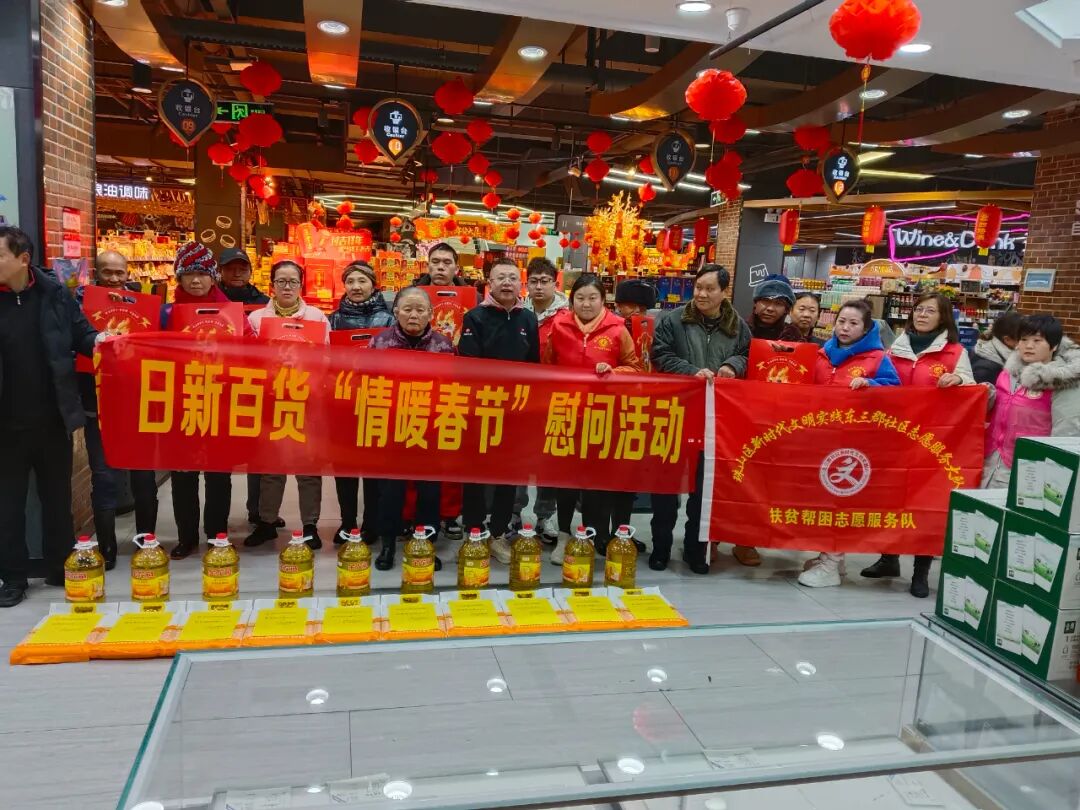 在春节来临之际,为切实关爱辖区弱势群体,弘扬社会主义核心价值观和“奉献、友爱、互助、进步”的中华民族传统美德,景德镇日新超市陶新店走进新厂街道东三郡社区开展“情暖春节”慰问活动,向困难群体、特扶家庭送上春节慰问“暖心包”,以实际行动传递社会温暖和关怀。