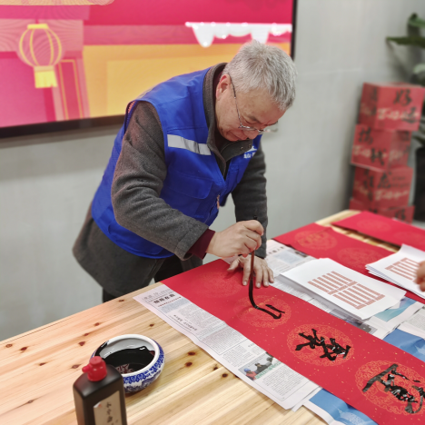 活动现场喜气洋洋,志愿者们和社区工作人员一起铺上红纸、研上浓墨3位书法爱好者一横一竖,一撇一捺,写出对新春的美好祝愿。在他们的挥笔之下,一个个喜庆的“福”字跃然纸上,一幅幅饱含“祝福”的春联随笔而出,一句句平安吉祥的迎春词句,承载着对新年的红火期望与祝福,送到了群众心坎上,为节日增添了浓浓的年味。