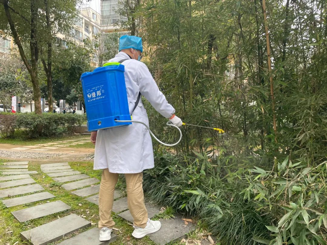 针对不同的环境,组织人员分别采用了不同的消杀方式,一组对居民小区及周边对草坪、树木、垃圾桶、井管道口、下水道、公共区域和主次干道绿化带等蚊蝇孳生地进行了喷药消杀活动。二组对办公场地外环境及周边开展消杀活动,并认真做好灭鼠毒饵的投放及更换,清理容易滋生病媒