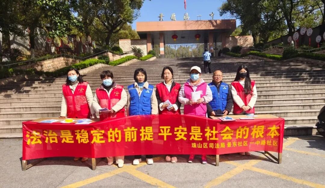 为进一步加大平安建设宣传力度,提高群众知晓率、参与率,增强居民法治观念和安全意识,3月20日上午,一中路社区新时代文明实践站联合珠山区司法局、景东社区共同开展以“法治是稳定的前提、平安是社会的根本”为主题的平安建设宣传活动。