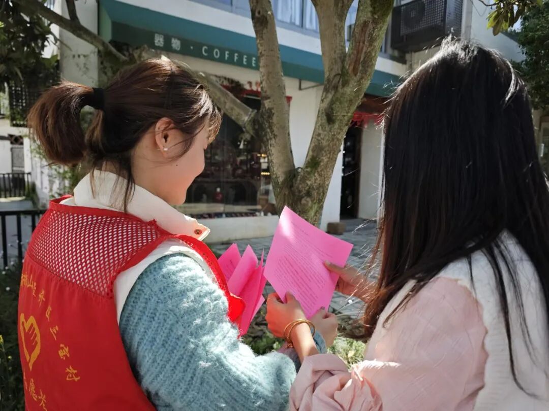 活动中,志愿者向过往行人和游客发放了文明旅游宣传单,提醒游客注重言谈举止,摒弃不良习惯,公共场所不大声喧哗,互相礼让,爱护公共设施,保护景区的生态环境,不乱扔垃圾。