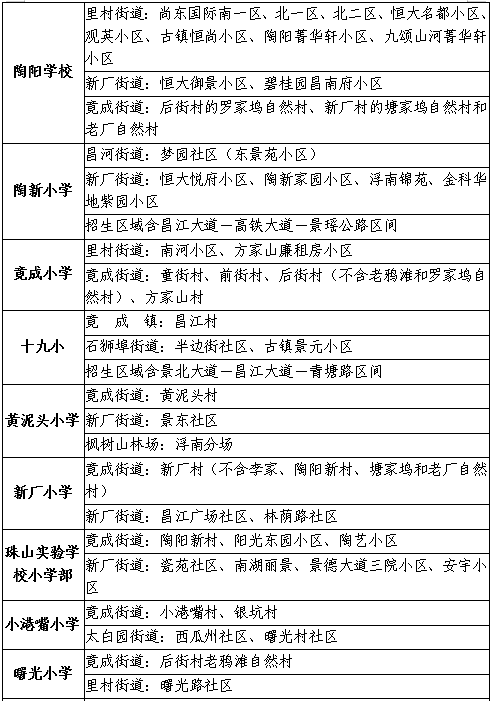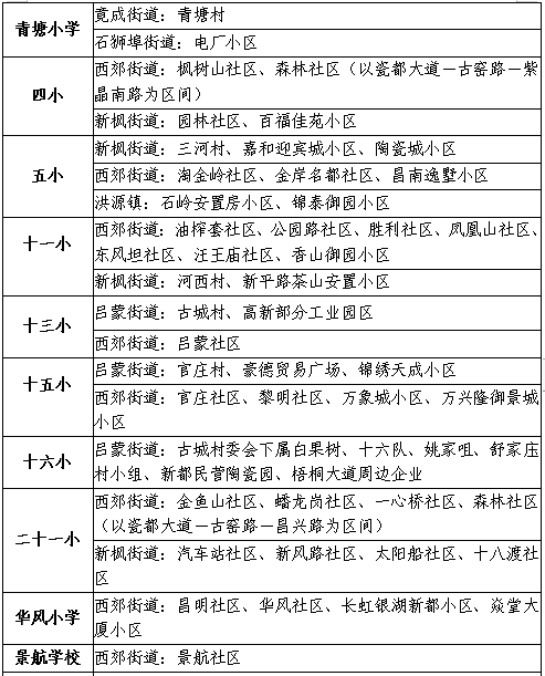 今年纳入对口直升的学校有:昌河小学(对口直升昌河中学)、五中、游泳学校(含原九中小学部,对口直升九中)、十六中、十七中、十九中、二十六中、珠山实验学校、昌江实验学校、十二中。