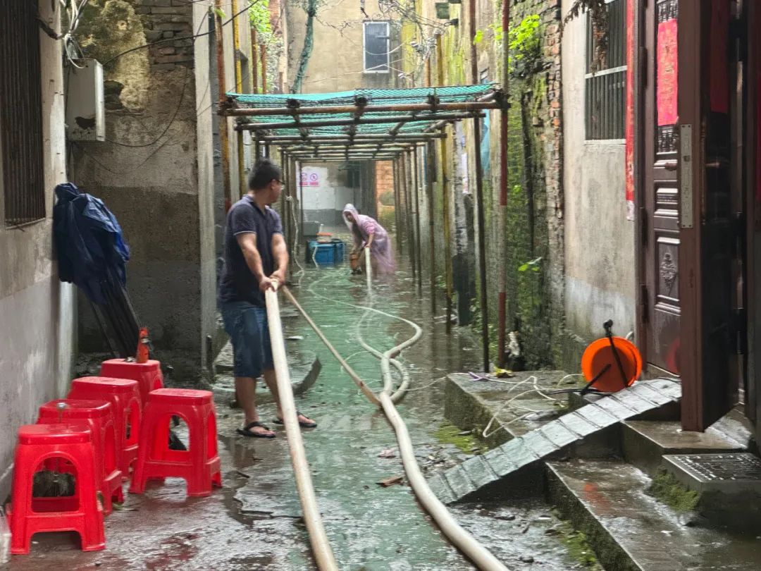 持续的强降雨让许多低洼地区产生了大量的积水,影响了居民的出行。为了让居民群众更好地生活,保障生命财产安全,石狮埠街道党员干部趁雨小组织人员抽排五龙山龙船弄内涝积水。