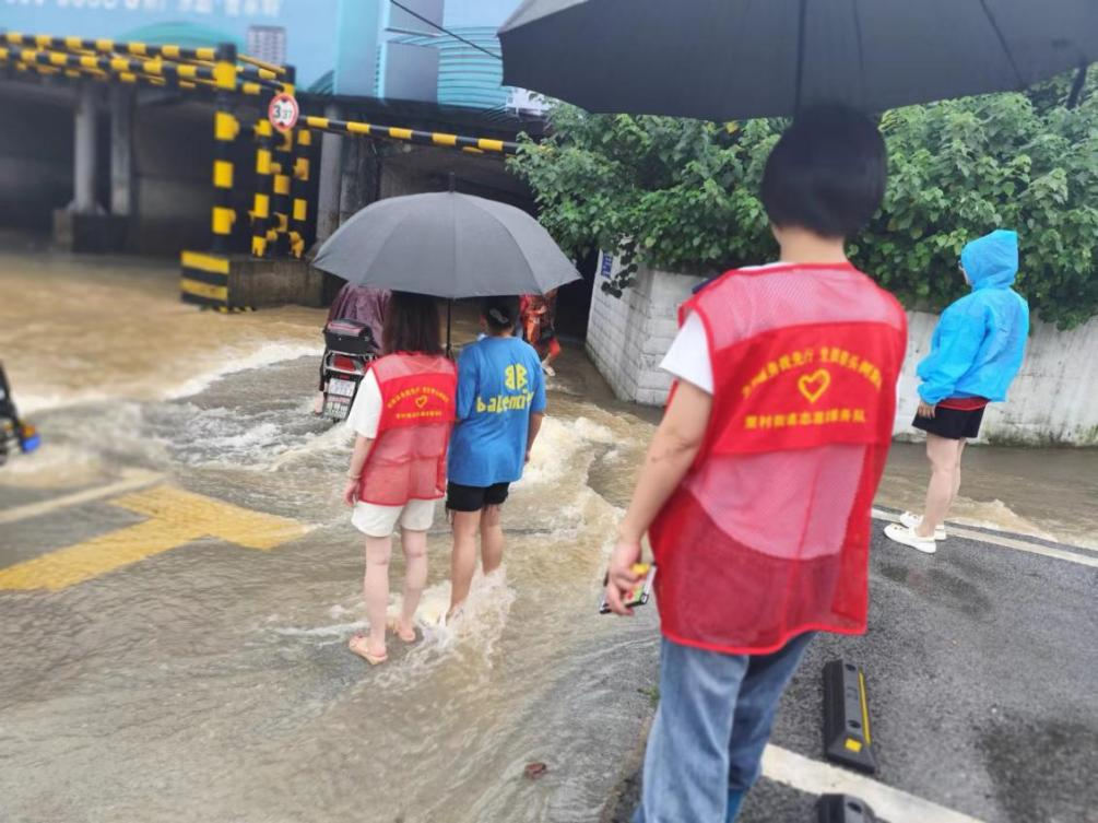 由于铁路十八户有大量积水流下来,造成里村桥洞路口出现倒灌。为了确保居民出行安全,新峰巷社区立即联系交警部门一起加大了对积水路段的交通疏导力度,提醒居民注意安全。