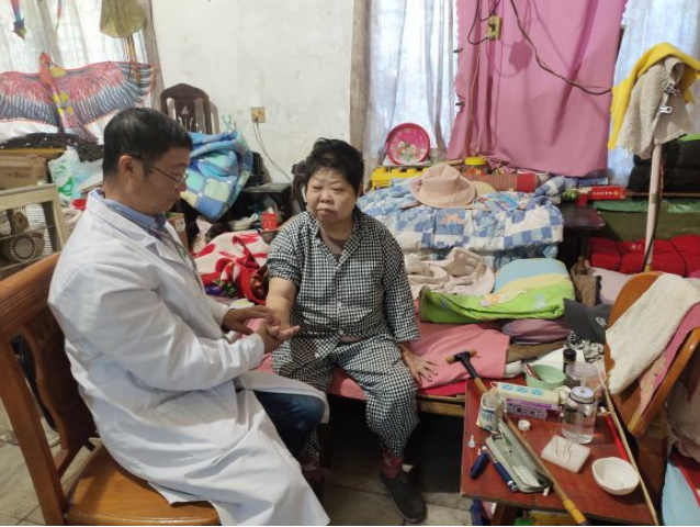 童宾社区的龚阿姨,是一位30多年的糖尿病病人,由于并发症导致行走困难。这是里村街道社区卫生服务中心家族医生团队第三次上门了,进行了血压测量和餐后血糖监测,控制得都挺好。