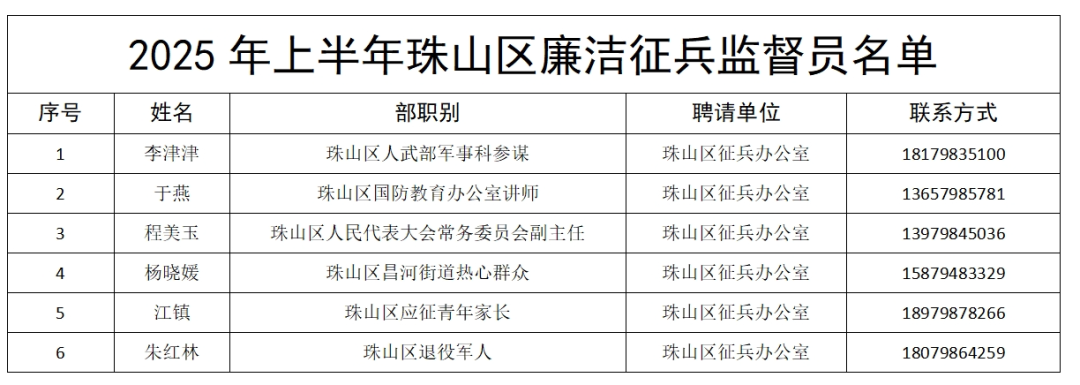 为严肃征兵纪律,有效防范和纠治征兵“微腐败”“暗腐败”问题和不正之风,保持廉洁征兵高压态势,营造风清气正征兵环境,依据中央军委、军委纪委、国防部征兵办和省委、省政府、省军区有关要求,现将“2025年上半年珠山区廉洁征兵群众监督活动”有关事项向社会公告如下: