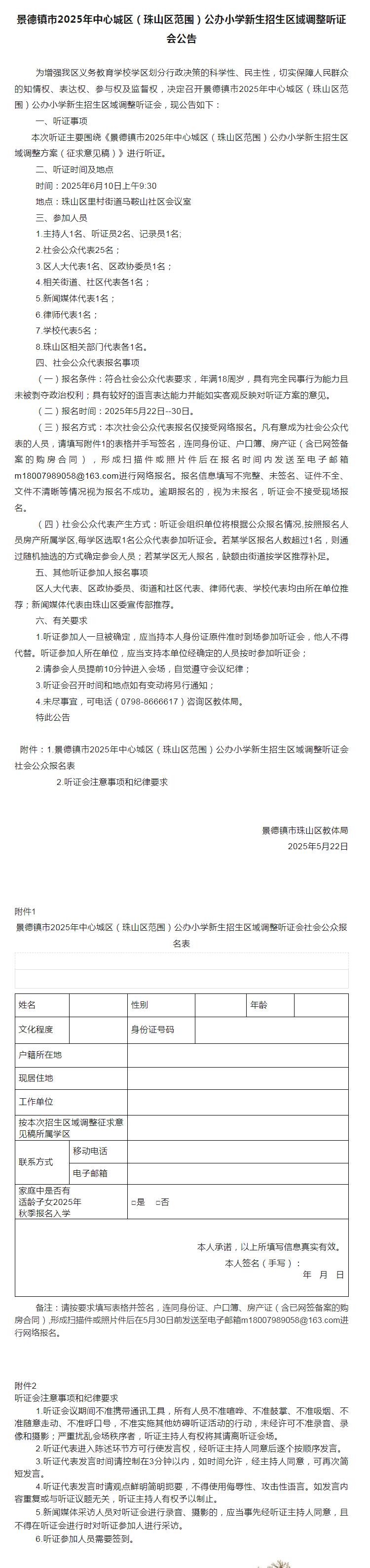 景德镇市2025年中心城区(珠山区范围)公办小学新生招生区域调整听证会公告