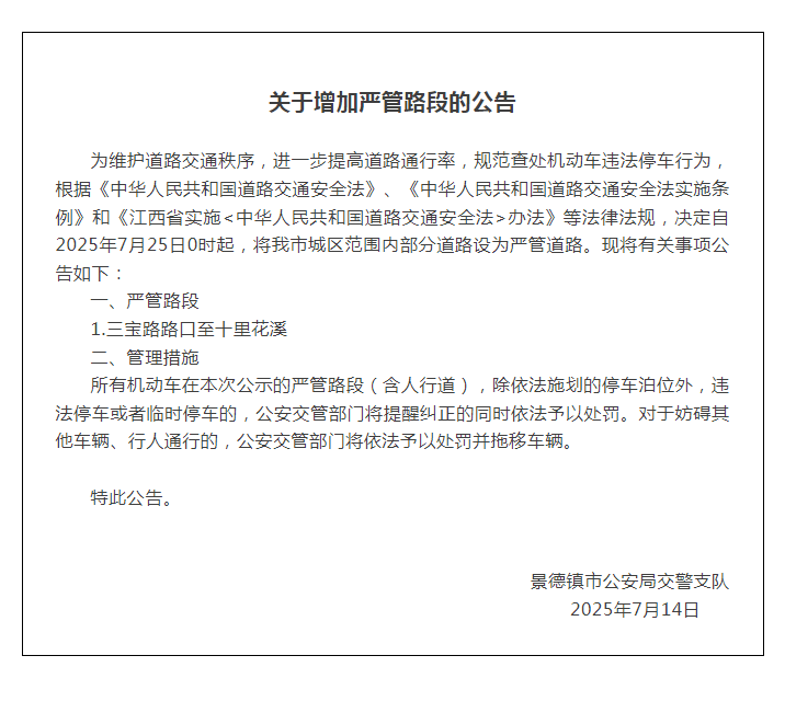 关于增加严管路段的公告