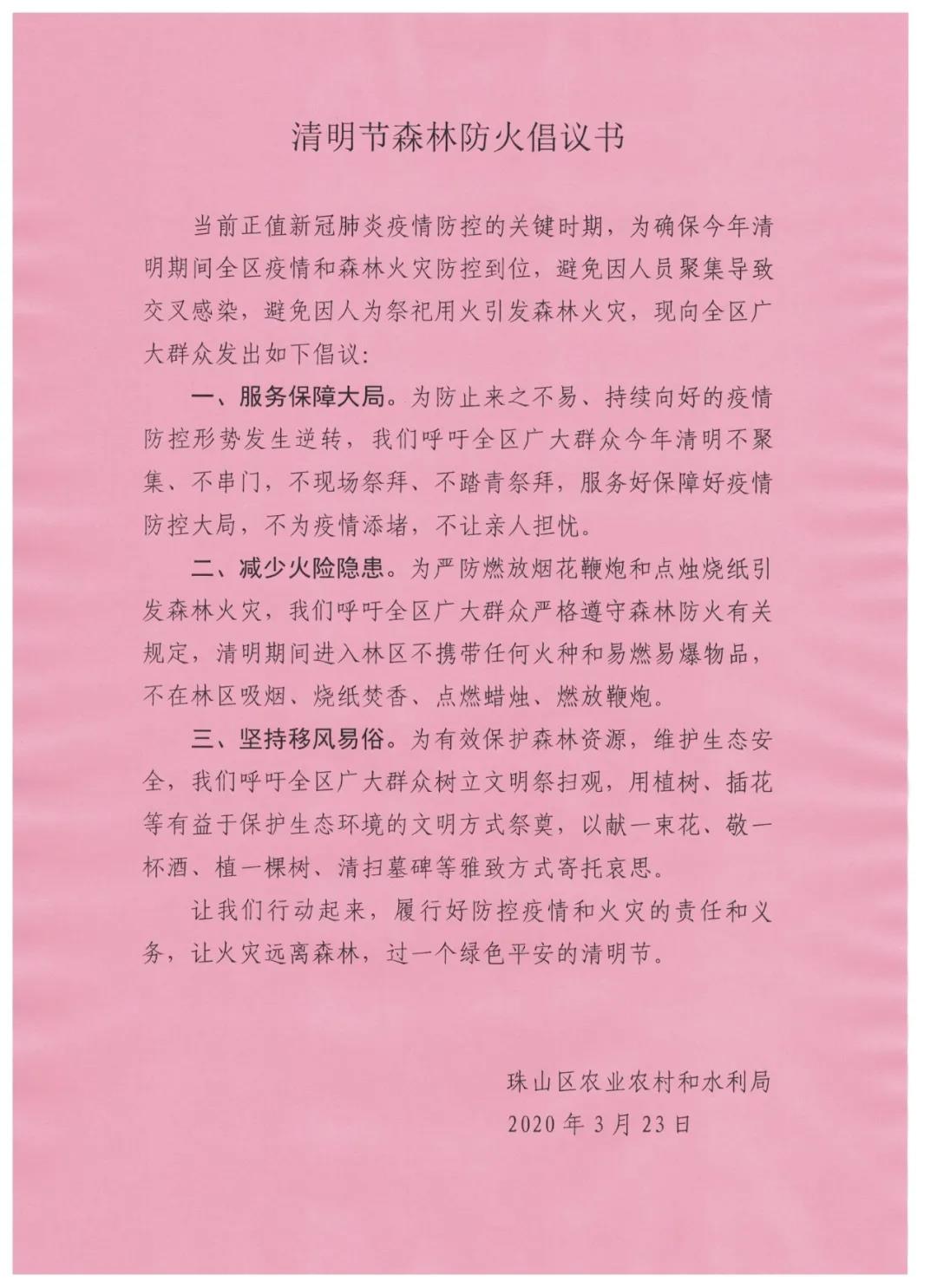 让我们行动起来,履行好防控疫情和火灾的责任和义务,让火灾远离森林,过一个绿色平安的清明节。