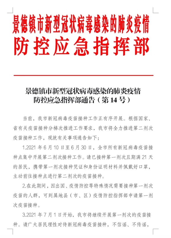1.2021年6月10日至6月30日,全市所有新冠病毒疫苗接种点集中开展第二剂次接种工作。请已接种第一剂次且期满21天的居民,携带第一剂次接种凭证和身份证明材料并佩戴好口罩,主动前往接种点进行第二剂次的疫苗接种。
