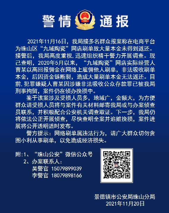 11月21日下午,珠山公安发布警情通报,寻找“九域陶瓷”网店刷单案件受害人,请受损人员尽快与珠山公安分局取得联系,配合公安机关调查取证。