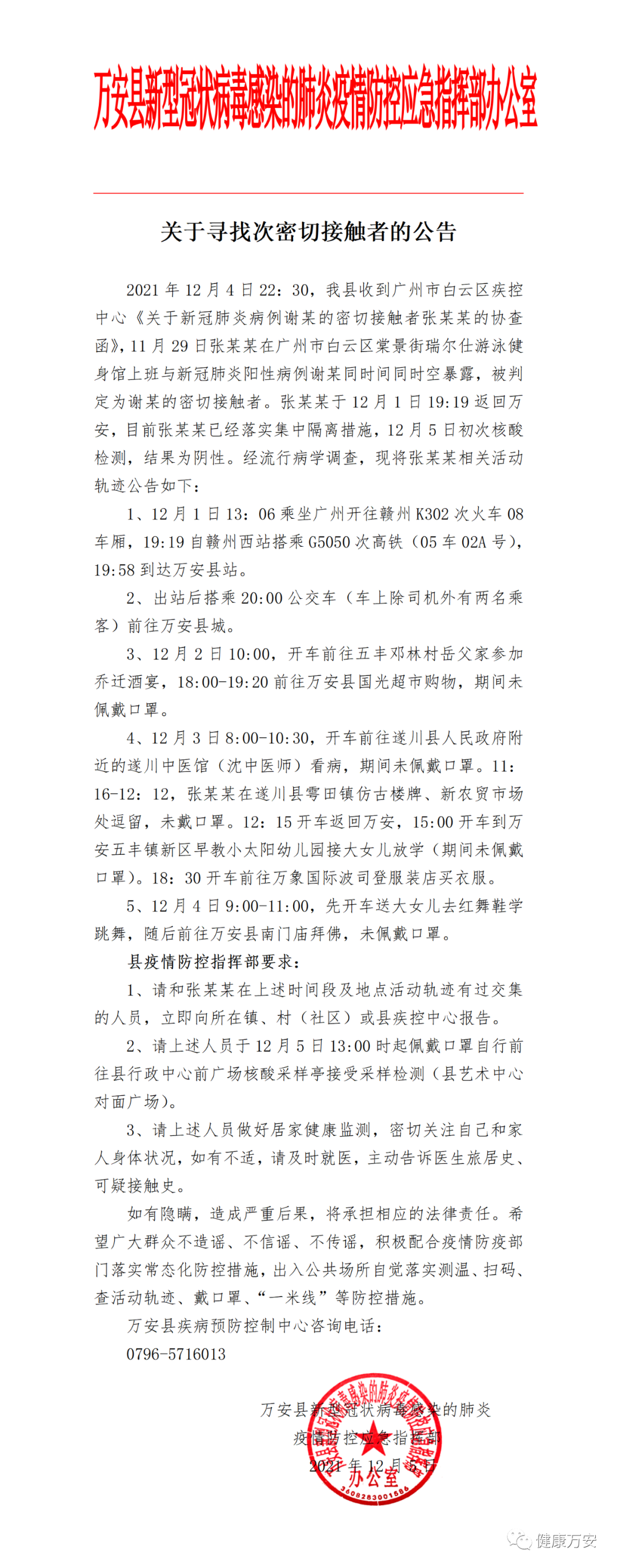 【风险提示】江西一地急寻次密切接触者!丨12月5日0-24时江西省新型冠状病毒肺炎疫情情况